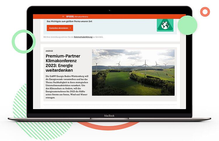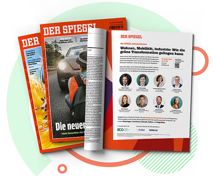 Die SPIEGEL-Klimakonferenz 2023 wurde mit zwei Printanzeigen im SPIEGEL, umfangreichen Werbemaßnahmen auf SPIEGEL.de sowie in den Newslettern »Die Lage am Morgen«, »Die Lage am Abend« und »Klimabericht« beworben.