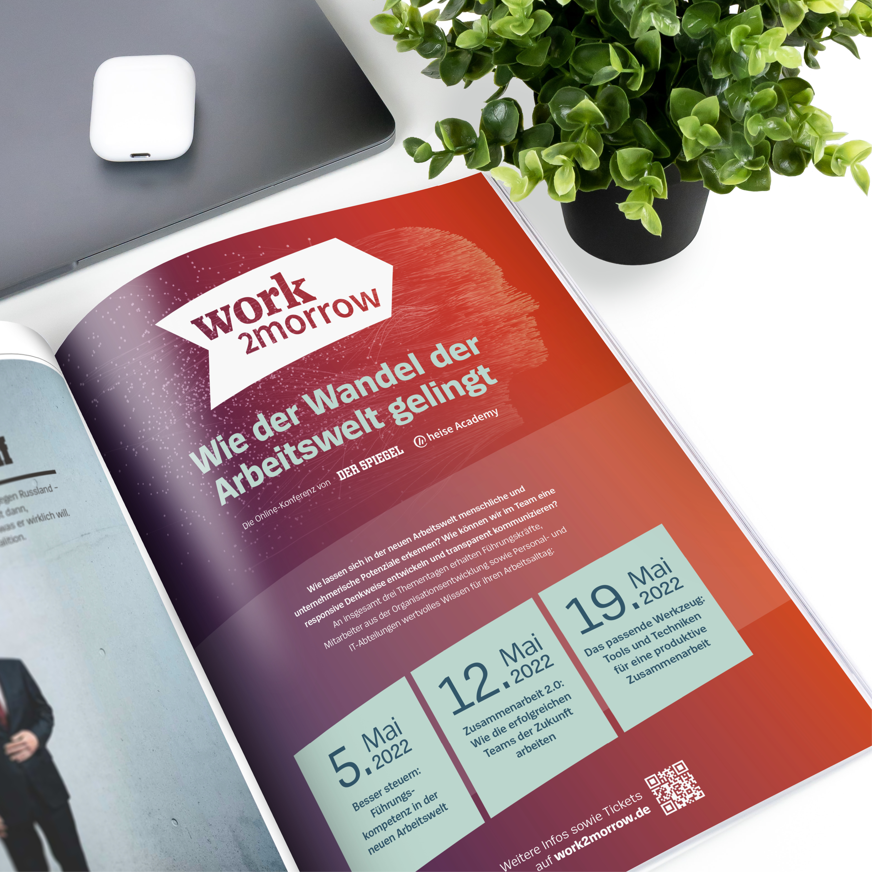 Im Rahmen einer Medien- und Veranstaltungskooperation mit der heise Academy – einem Geschäftsbereich der Heise Medien GmbH & Co. KG – organisierte die MANUFAKTUR die kostenpflichtige Onlinekonferenz work2morrow. Ganz im Sinne des »Collaborative Advantage« näherten sich beide Partner dem Veranstaltungskonzept aus unterschiedlichen inhaltlichen Perspektiven. Während DER SPIEGEL das Thema mit einer gesellschaftlichen und wirtschaftlichen Expertise begleitete, bot die heise Academy die technische und infrastrukturelle Kompetenz. Zu den Aufgaben der MANUFAKTUR gehörten das Projektmanagement, die Ausgestaltung des Programms sowie die mediale Aufbereitung, das Design und die Nutzer:innenansprache auf unterschiedlichen Kanälen.